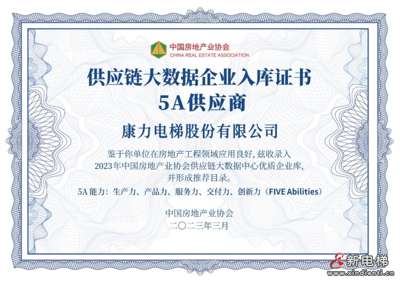 康力電梯同時入選2023年中國房地產(chǎn)業(yè)協(xié)會供應(yīng)鏈大數(shù)據(jù)中心優(yōu)質(zhì)企業(yè)庫“5A供應(yīng)商”(5A,F(xiàn)IVEABILITIES,即生產(chǎn)力、產(chǎn)品力、服務(wù)力、交付力、創(chuàng)新力)。
