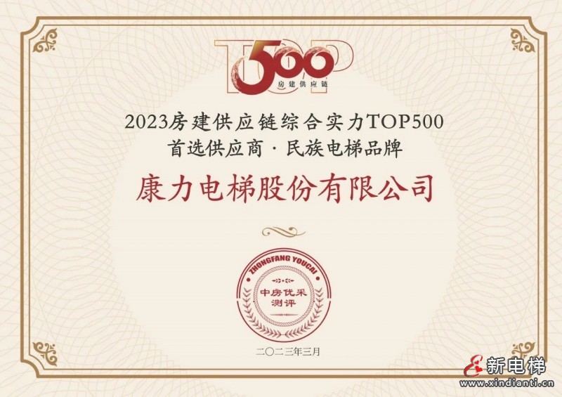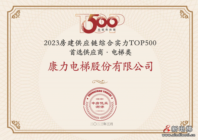 連續(xù)11年登榜 | 康力電梯榮膺“2023房建供應(yīng)鏈綜合實力TOP500-首選供應(yīng)商·電梯類”10強!