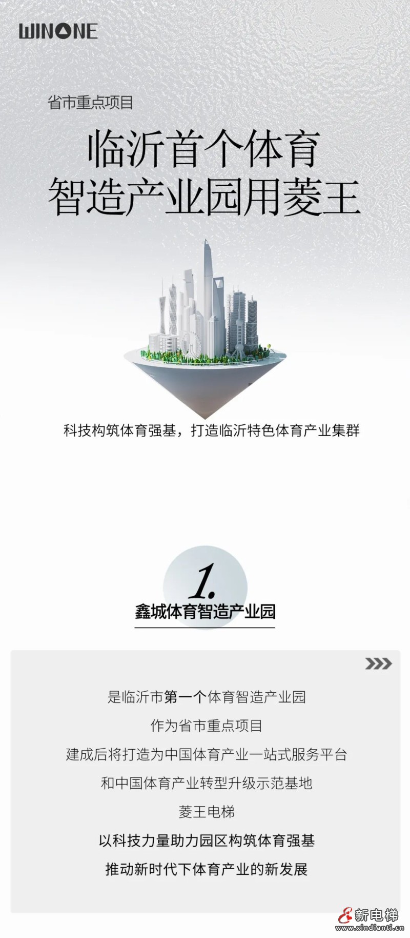 鑫城體育智造產(chǎn)業(yè)園是臨沂市第一個(gè)體育智造產(chǎn)業(yè)園,作為省市重點(diǎn)項(xiàng)目建成后將打造為中國體育產(chǎn)業(yè)一站式服務(wù)平臺,和中國體育產(chǎn)業(yè)轉(zhuǎn)型升級示范基地,菱王電梯以科技力量助力園區(qū)構(gòu)筑體育強(qiáng)基,推動新時(shí)代下體育產(chǎn)業(yè)的新發(fā)展。