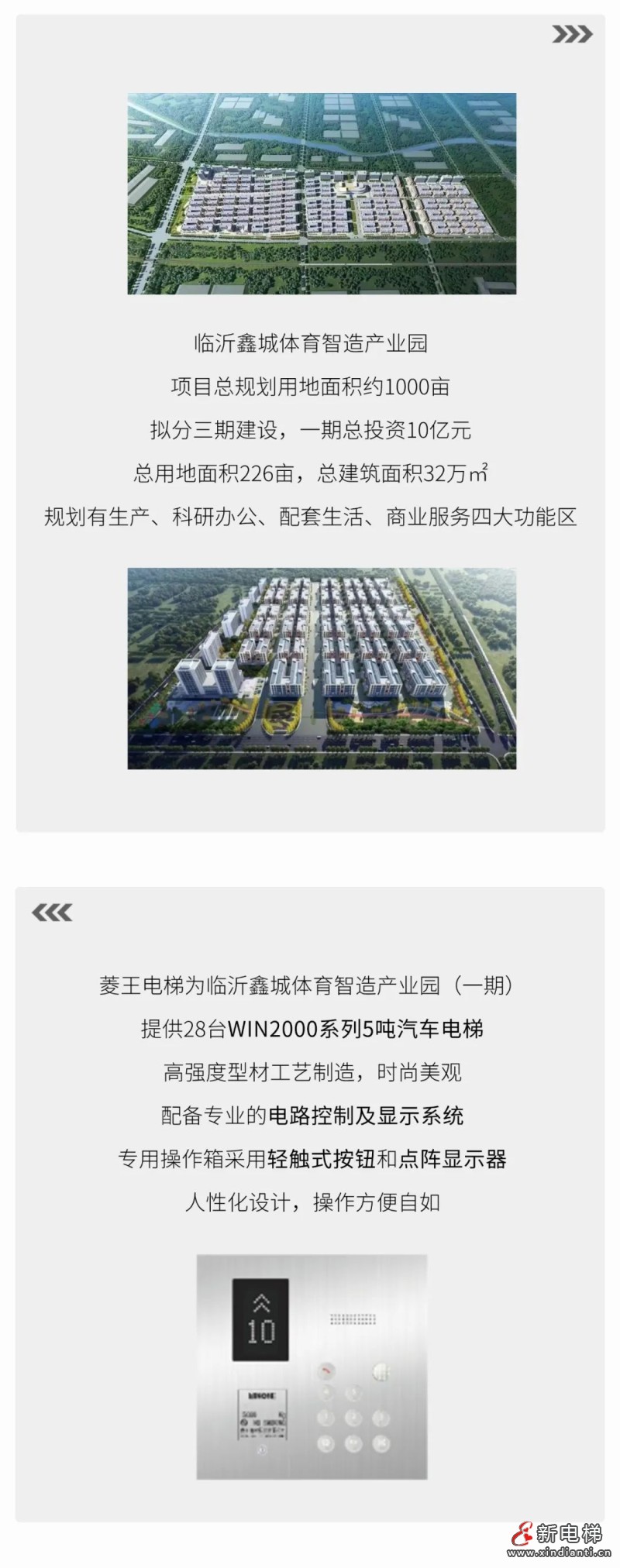 核心提示:鑫城體育智造產(chǎn)業(yè)園是臨沂市第一個(gè)體育智造產(chǎn)業(yè)園,作為省市重點(diǎn)項(xiàng)目建成后將打造為中國體育產(chǎn)業(yè)一站式服務(wù)平臺,和中國體育產(chǎn)業(yè)轉(zhuǎn)型升級示范基地,菱王電梯以科技力量助力園區(qū)構(gòu)筑體育強(qiáng)基,推動新時(shí)代下體育產(chǎn)業(yè)的新發(fā)展。