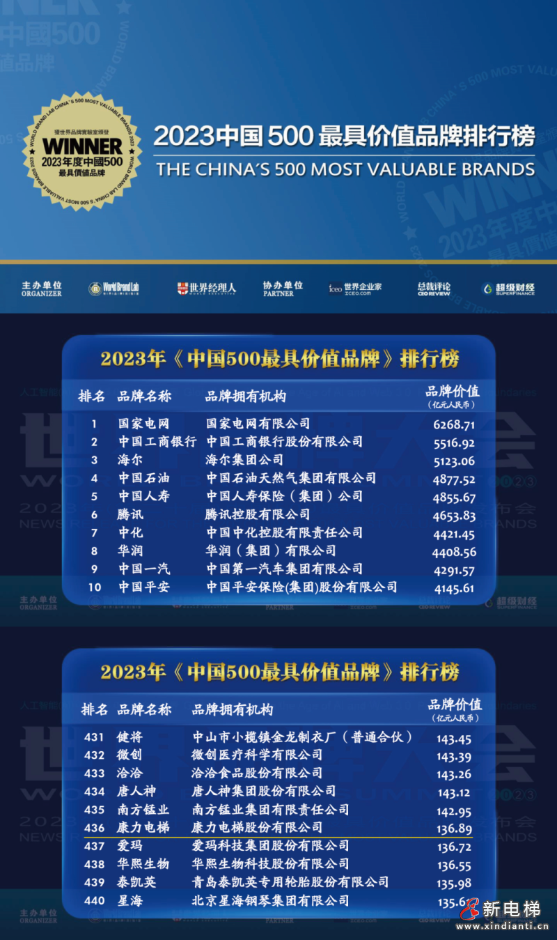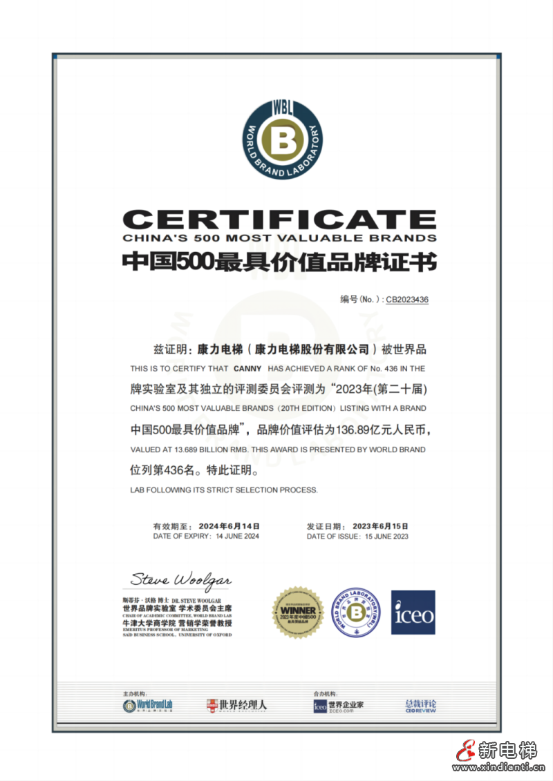 品牌價(jià)值136+億!康力電梯躋身2023年中國500最具價(jià)值品牌