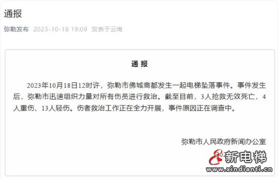 2023年10月18日12時(shí)許,云南彌勒市佛城商都發(fā)生一起電梯墜落事件。事件發(fā)生后,彌勒市迅速組織力量對(duì)所有傷員進(jìn)行救治。截至目前,3人搶救無(wú)效死亡,4人重傷、13人輕傷。傷者救治工作正在全力開(kāi)展,事件原因正在調(diào)查中。