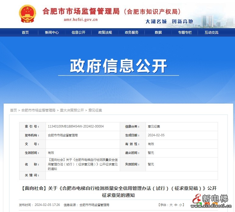 關(guān)于《合肥市電梯自行檢測質(zhì)量安全信用管理辦法(試行)(征求意見稿)》公開征求意見的通知