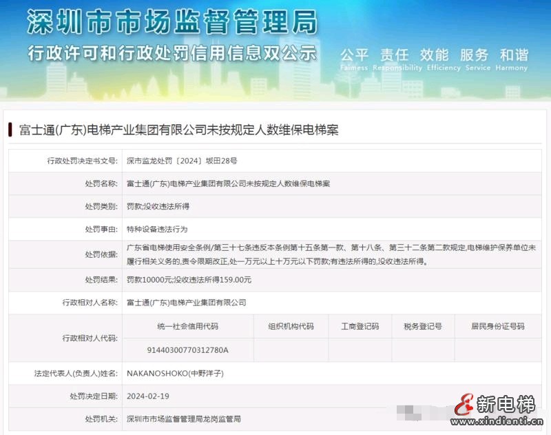 富士通(廣東)電梯產(chǎn)業(yè)集團(tuán)有限公司未按規(guī)定人數(shù)維保電梯案