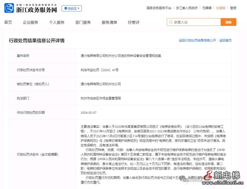 通力電梯杭州分公司違反特種設(shè)備安全管理規(guī)定案