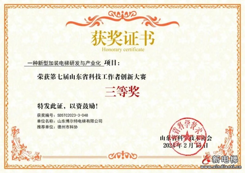 2024年2月22日,山東省科學(xué)技術(shù)協(xié)會發(fā)布《關(guān)于公布山東省第七屆科技工作者創(chuàng)新大賽獲獎結(jié)果的通知》,公布大賽評選結(jié)果。 由山東博爾特電梯有限公司申報,德州市科協(xié)推薦的《一種新型加裝電梯研發(fā)與產(chǎn)業(yè)化》項目榮獲全省三等獎。