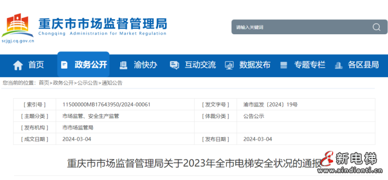 核心提示:重慶市市場監(jiān)督管理局關于2023年全市電梯安全狀況的通報