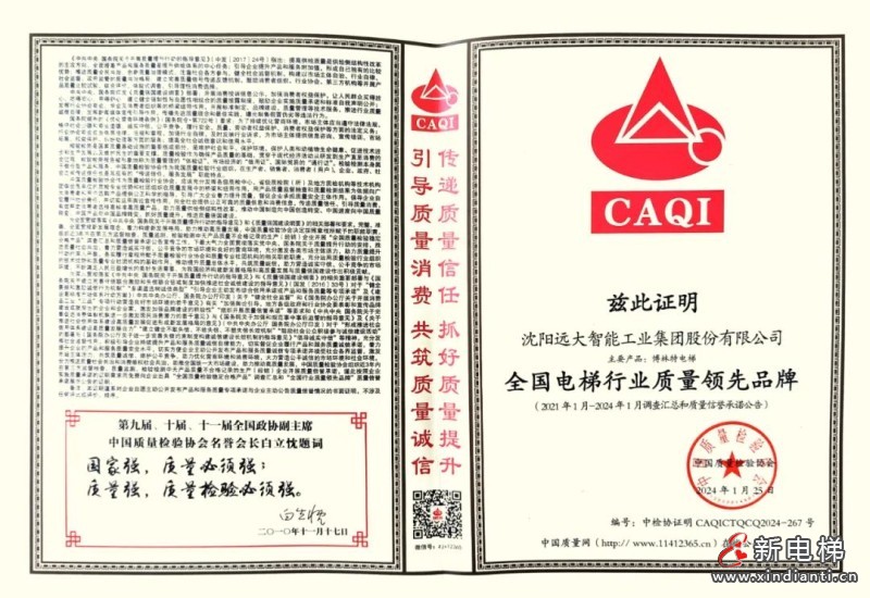 在這個(gè)特殊的日子里,遠(yuǎn)大智能一舉攬獲由中國(guó)質(zhì)量檢驗(yàn)協(xié)會(huì)授予的“全國(guó)電梯行業(yè)質(zhì)量領(lǐng)先企業(yè)”、“全國(guó)電梯行業(yè)質(zhì)量領(lǐng)先品牌”兩項(xiàng)重磅榮譽(yù)。