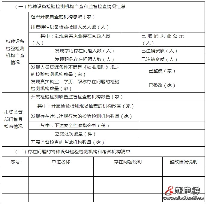 各地市場監(jiān)管部門要對轄區(qū)內(nèi)特種設(shè)備檢驗檢測機(jī)構(gòu)自查工作進(jìn)行指導(dǎo)、督促和跟蹤檢查。特種設(shè)備檢驗檢測機(jī)構(gòu)完成上述自查工作后,對發(fā)現(xiàn)的問題應(yīng)當(dāng)立即整改,填寫《特種設(shè)備檢驗檢測機(jī)構(gòu)自查情況統(tǒng)計表》(見附件1),簽字蓋章后于7月底前報送住所所在地的地市級市場監(jiān)管部門。