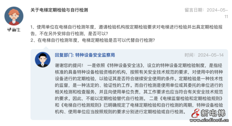 在電梯自行檢測(cè)年度,定期檢驗(yàn)?zāi)芊翊孀孕袡z測(cè)?總局最新回復(fù)!