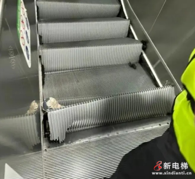 網(wǎng)友發(fā)布的視頻顯示,地鐵站內一部扶梯發(fā)生故障后暫停下來,靠近底部的一處踏板受損變形,一只鞋子卡在縫隙處。一名身穿工作背心的男子靠近電梯,正在查看情況。