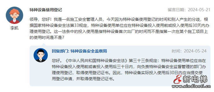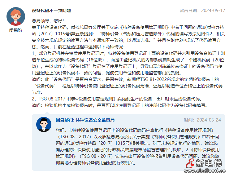 當(dāng)前位置:首頁>電梯資訊 >電梯新聞News>關(guān)于特種設(shè)備使用登記的編碼和時間等問題,總局答復(fù)
