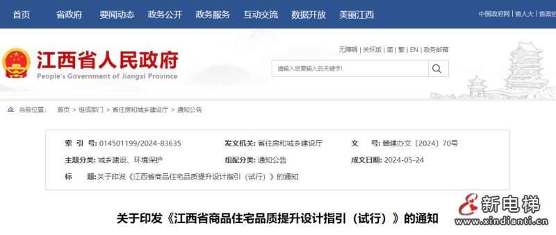 江西省住房和城鄉(xiāng)建設(shè)廳2024年5月24日印發(fā)《江西省商品住宅品質(zhì)提升設(shè)計(jì)指引(試行)》。