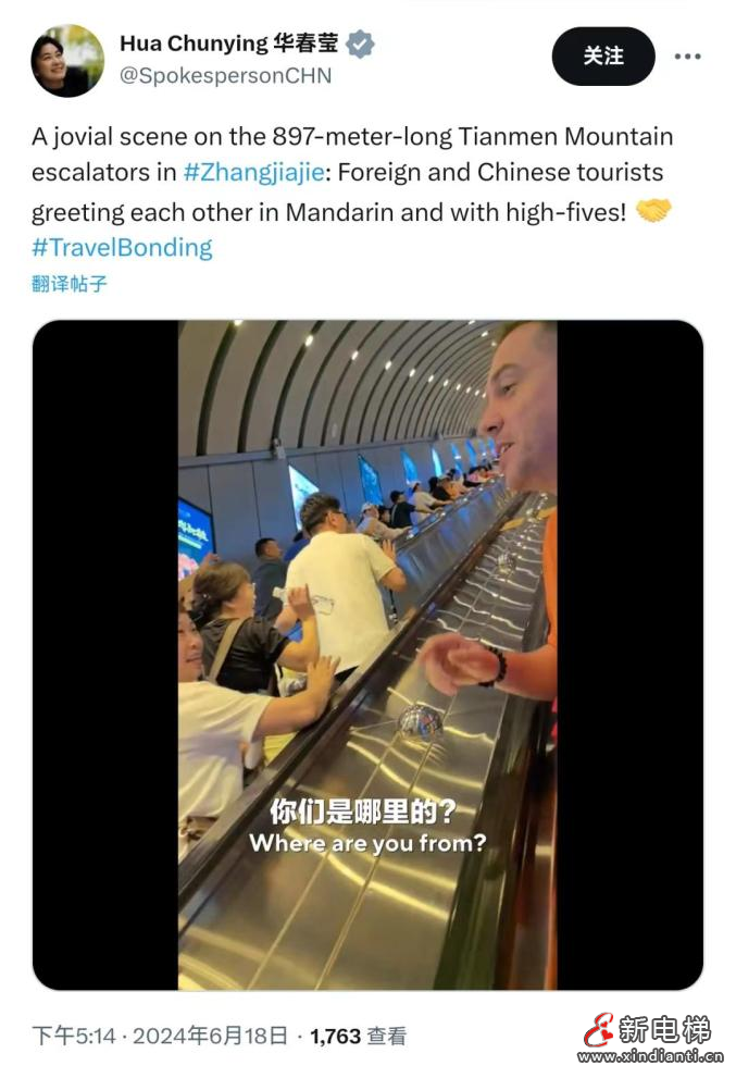 6月18日下午,外交部副部長(zhǎng)華春瑩在社交媒體分享了Chinatravel歡樂(lè)一幕:張家界天門(mén)山897米長(zhǎng)的自動(dòng)扶梯上,來(lái)自五湖四海的中外游客用普通話打招呼,并友好擊掌致意,熱情與真誠(chéng)感染著每一個(gè)人。