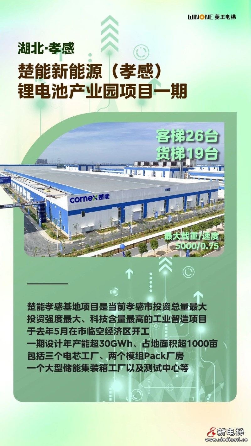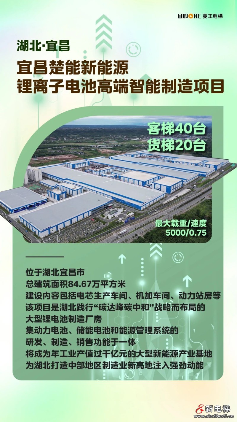 江西宜昌楚能新能源鋰離子電池高端智能制造項(xiàng)目,菱王客梯40臺(tái)、貨梯20臺(tái),最大載重/速度5000/0.75。