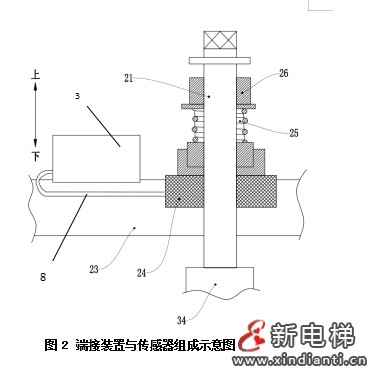 依據(jù)上述需要解決的三項(xiàng)要求及選用電阻應(yīng)變傳感器作為基本要點(diǎn),構(gòu)建本發(fā)明超載保護(hù)裝置與端接裝置及其系統(tǒng)。見圖1、圖2所示,圖1超載裝置及系統(tǒng)配套示意圖,由電梯總成、超載裝置1、控制器7、虛擬主機(jī)6、端接裝置2(由數(shù)個(gè)組成)、對(duì)重4及轎廂5等構(gòu)成。圖2由單個(gè)端接裝置2、接線盒3、繩頭板23與電阻應(yīng)變式傳感器24組成?,F(xiàn)分析超載裝置1的工作原理,當(dāng)單個(gè)電阻應(yīng)變式傳感器24(見圖2)受重力作用時(shí),其輸出與重力成線性關(guān)系的電壓信號(hào)(如滿量程2MV左右),其輸出的電壓信號(hào)經(jīng)放大器放大送到控制器7(見圖1),經(jīng)過模數(shù)轉(zhuǎn)換器(A/D),將模擬信號(hào)轉(zhuǎn)換成數(shù)字信號(hào),送到虛擬主機(jī)6進(jìn)行邊緣計(jì)算或邏輯處理后,控制器7將數(shù)字量傳輸?shù)诫娍毓耧@示器上顯示相關(guān)綜合處理數(shù)據(jù)。如每個(gè)端接裝置7具體數(shù)字量,則依據(jù)此數(shù)據(jù)分別調(diào)整各端接裝置。另一方面將其數(shù)字量傳輸?shù)讲僮飨到y(tǒng)中,經(jīng)微處理機(jī)實(shí)施電梯運(yùn)行各功能調(diào)配。例如電梯根據(jù)稱重裝載實(shí)際負(fù)載,給出相應(yīng)啟動(dòng)電流,讓電梯控制變得更為平穩(wěn)順暢,使電梯運(yùn)行的舒適感、穩(wěn)定性以及節(jié)電性達(dá)到最佳狀態(tài)。當(dāng)電梯出現(xiàn)超載時(shí),經(jīng)電梯控制系統(tǒng)處理,使電梯門不能關(guān)閉、不能選層;同時(shí)切斷其供電回路,使電梯不能啟動(dòng)。并滿足上述國家標(biāo)準(zhǔn)中部分條款規(guī)定要求,實(shí)現(xiàn)對(duì)電梯的超載保護(hù)。
