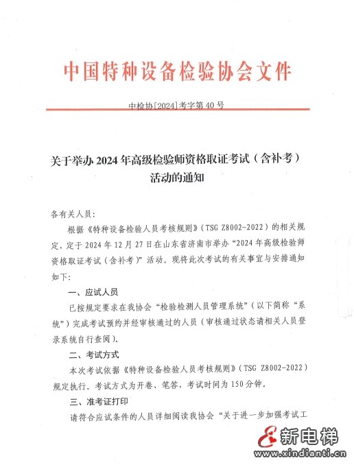 當(dāng)前位置:首頁(yè)>電梯資訊 >電梯新聞News>山東濟(jì)南將舉辦“2024年高級(jí)檢驗(yàn)師資格取證考試(含補(bǔ)考)”活動(dòng)
