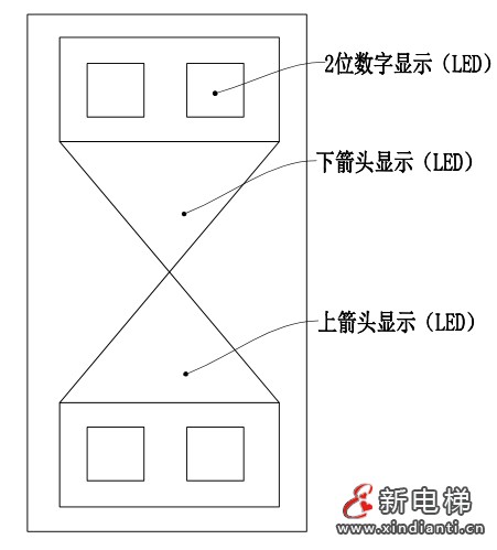 圖示層站指示燈如圖7所示,采用高清LED電子顯示器,用跳躍式數(shù)字與箭頭組成計(jì)時(shí)器型式。箭頭上端及下端部分分別表示電梯上行或下行的層站指示燈,兩端數(shù)字表示預(yù)測(cè)電梯上行或下行等待時(shí)間的信號(hào)燈。