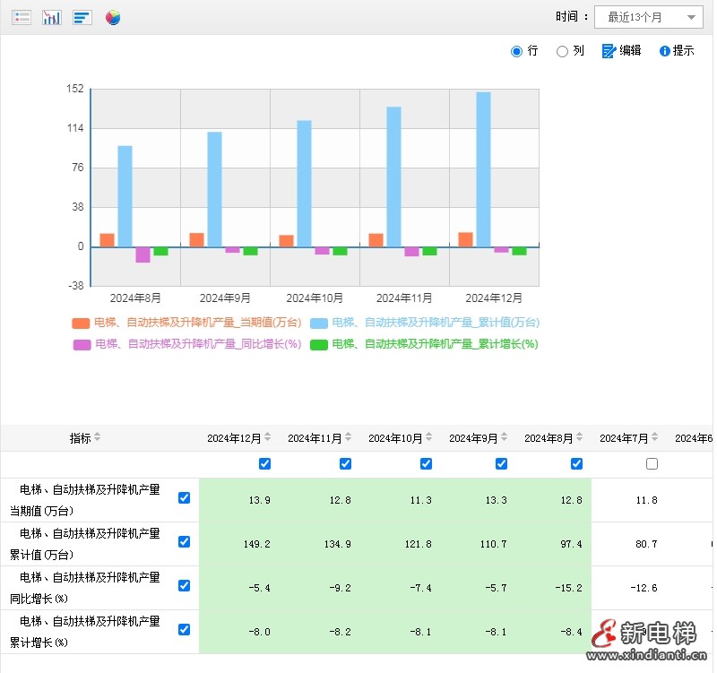 根據(jù)國(guó)家統(tǒng)計(jì)局公布的最新數(shù)據(jù),2024年12月全國(guó)電梯、自動(dòng)扶梯及升降機(jī)產(chǎn)量為13.9萬(wàn)臺(tái),1-12月(2024年全年)累計(jì)產(chǎn)量149.2萬(wàn)臺(tái)。月度產(chǎn)量統(tǒng)計(jì)如下。