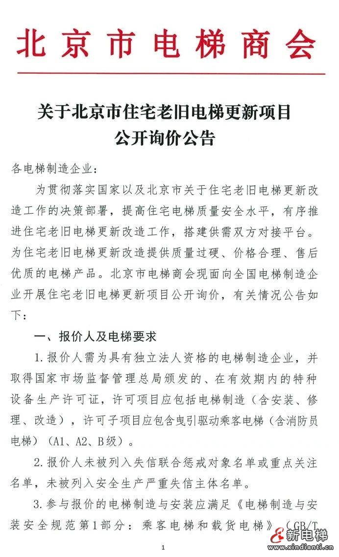 核心提示:北京市電梯商會現(xiàn)面向全國電梯制造企業(yè)開展住宅老舊電梯更新項目公開詢價.