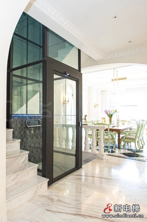 井道外框是黑色金屬材質(zhì),配上雙層夾膠玻璃,又穩(wěn)又通透。