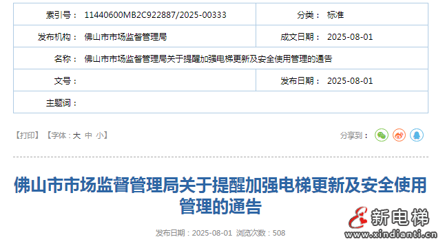 廣東省佛山市市場(chǎng)監(jiān)督管理局發(fā)布《關(guān)于提醒加強(qiáng)電梯更新及安全使用管理的通告》。老舊住宅電梯更新需采購(gòu)符合《市場(chǎng)監(jiān)管總局辦公廳關(guān)于進(jìn)一步做好住宅老舊電梯更新有關(guān)工作的通知》(市監(jiān)特設(shè)發(fā)〔2025〕52號(hào))要求的電梯產(chǎn)品,確保質(zhì)量過(guò)硬、售后優(yōu)質(zhì)‌。建議優(yōu)先選用原廠配件或原廠認(rèn)可的適配件,對(duì)老舊、故障零部件應(yīng)修盡修、應(yīng)換盡換‌。