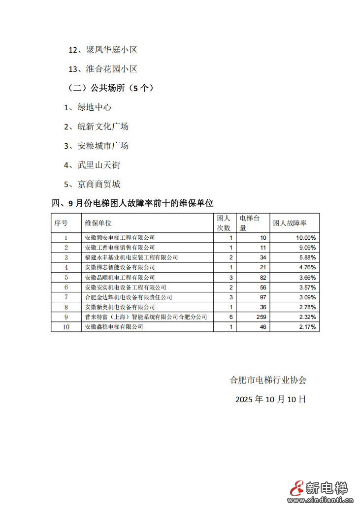 合肥電梯協(xié)會通報全市電梯應(yīng)急救援高發(fā)小區(qū)及電梯故障率前十單位