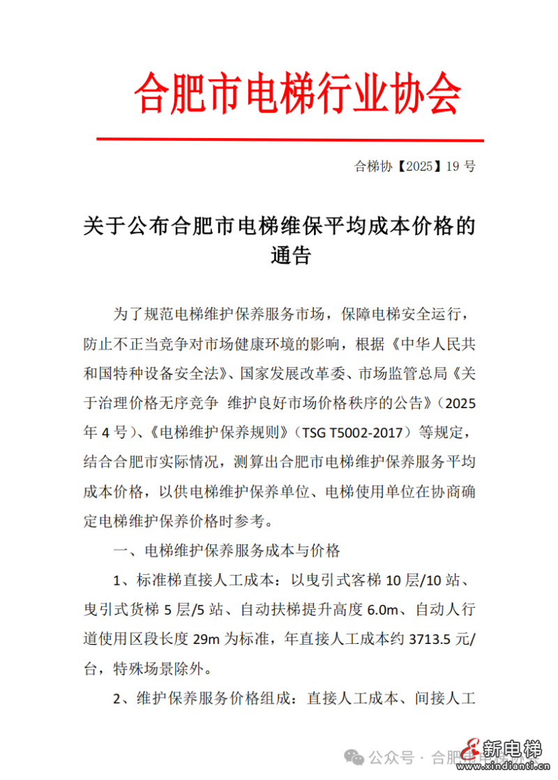 合肥市電梯行業(yè)協(xié)會(huì)發(fā)布《關(guān)于公布合肥市電梯維保平均成本價(jià)格的通告》