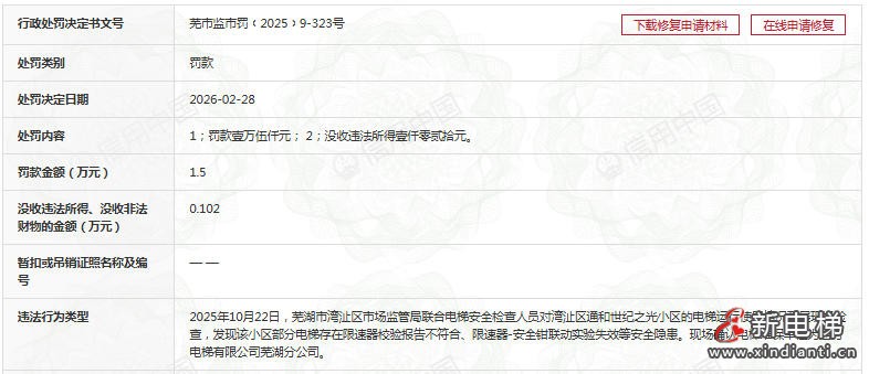通力電梯蕪湖分公司因維保不合規(guī)被罰款1.5萬元