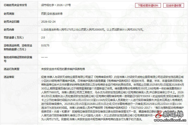 根據(jù)相關(guān)執(zhí)法信息,永大電梯福建分公司與詔安天成物業(yè)服務(wù)有限公司簽訂合同,負責‌詔安世茂遠晟云城小區(qū)19部電梯‌的維護保養(yǎng)工作。然而在執(zhí)行過程中,該公司維保人員‌未嚴格執(zhí)行《電梯維護保養(yǎng)規(guī)則》(TSG T5002-2017)‌,存在多項違規(guī)行為:‌未實際進入底坑開展必要檢查操作‌,違反了維保必須覆蓋關(guān)鍵部位的安全要求;‌維保記錄與實際情況不符‌,存在虛假填報或形式化記錄問題,影響電梯安全追溯與監(jiān)管。