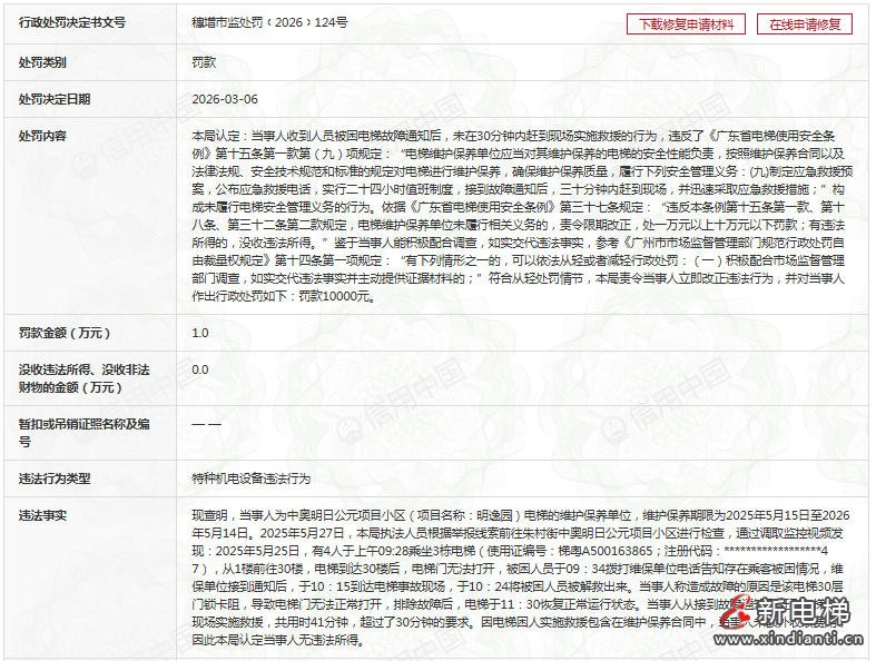 2026年3月6日,廣州市增城區(qū)市場監(jiān)督管理局對通力電梯有限公司廣州分公司作出行政處罰,罰款1萬元,事由為該公司在電梯困人事件中未按規(guī)定時限抵達(dá)現(xiàn)場救援。