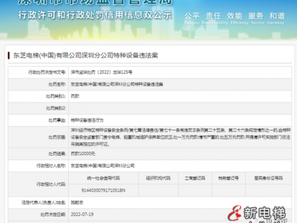 7月20日,根據(jù)深圳市市場(chǎng)監(jiān)督管理局網(wǎng)站公布的行政處罰決定書(shū)(深市監(jiān)華處罰〔2022〕龍華125號(hào))顯示,東芝電梯(中國(guó))有限公司深圳分公司因特種設(shè)備違法案...[詳情]