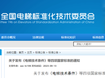 根據(jù)2023年第9號中國國家標準公告,國家市場監(jiān)督管理總局、國家標準化管理委員會批準了電梯委員會歸口的《電梯技術條件》《電梯安裝驗收規(guī)范》、《提高在用電梯安全性的規(guī)范》、《安裝于現(xiàn)有建筑物中的新電梯制造與安裝安全規(guī)范》4項國家標準?,F(xiàn)予以公告。