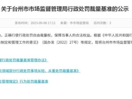 日前,臺州市市場監(jiān)督管理局發(fā)布行政處罰裁量基準公示,其中違反《泰州市電梯安全管理規(guī)定》行為處罰裁量基準中規(guī)定。[詳情]