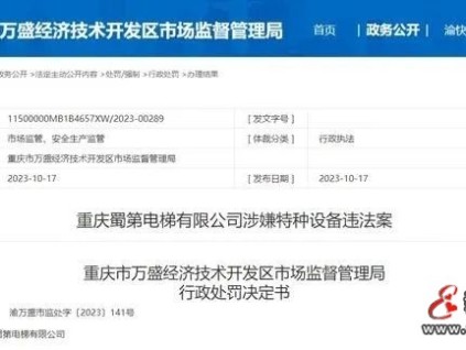 近日,重慶市萬盛經(jīng)濟(jì)技術(shù)開發(fā)區(qū)市場監(jiān)督管理局披露,重慶蜀第電梯有限公司作為當(dāng)事人,在一經(jīng)營場所安裝并交付使用1臺未經(jīng)檢驗(yàn)合格、未辦理特種設(shè)備使用登記...[詳情]