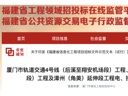 廈門市軌道交通4號線(后溪至翔安機場段)工程、廈門市軌道交通6號線(林埭西至華僑大學段)工程及漳州(角美)延伸段工程電、扶梯采購與安裝[詳情]