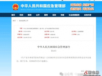 《生產(chǎn)安全事故罰款處罰規(guī)定》已經(jīng)2023年12月25日應急管理部第32次部務會議審議通過,現(xiàn)予公布,自2024年3月1日起施行。