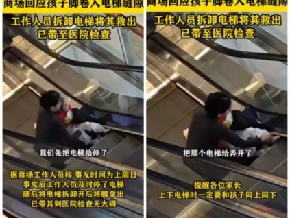 1月17日,山東日照。有網(wǎng)友發(fā)視頻稱在商場有一位小孩腳被卡入扶梯縫隙,并提醒各位家長上下電梯時,一定和孩子同上同下。[詳情]