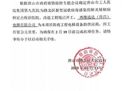 西繼迅達(dá)在圓滿完成北京小湯山醫(yī)院和寧夏銀川第四人民醫(yī)院的生產(chǎn)發(fā)運(yùn)任務(wù)后,日前又勇?lián)粕绞泄と酸t(yī)院集團(tuán)第九醫(yī)院電梯任務(wù)。[詳情]