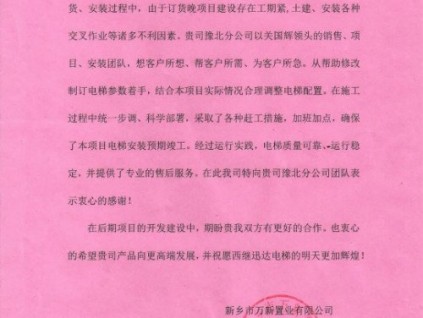 近日,西繼迅達(dá)收到一封來自萬新置業(yè)相關(guān)領(lǐng)導(dǎo)送來的感謝信,信中“想客戶所想、幫客戶所需、為客戶所急”等語句,承載著對西繼迅達(dá)電梯的充分肯定和認(rèn)可。[詳情]