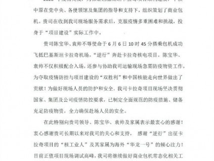中核集團(tuán)為東南電梯發(fā)來(lái)的感謝信,感謝“逆行”出征卡拉奇項(xiàng)目的“核工業(yè)人”及其家屬為 海外“華龍一號(hào)”的傾心注力!感謝東南電梯為中國(guó)核電走向世界做出了...[詳情]