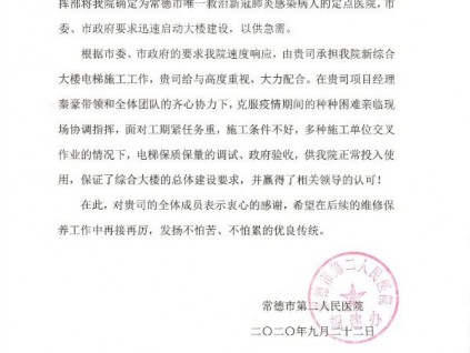 近日,一封來自常德市第二人民醫(yī)院的電梯施工表揚信送到了西繼迅達電梯,醫(yī)院相關(guān)領(lǐng)導(dǎo)表達了對公司項目經(jīng)理及全體團隊的誠摯感謝。面對今年疫情的特殊情況,...[詳情]